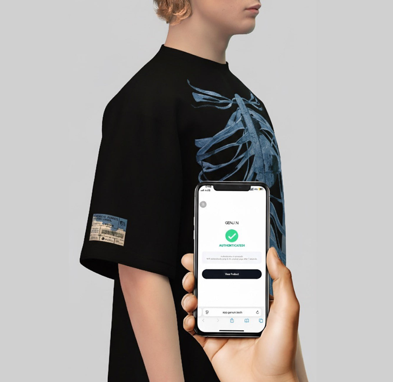 NFC chip embedded at the hem. Tap your phone to verify ownership, reveal product info, and begin your journey.